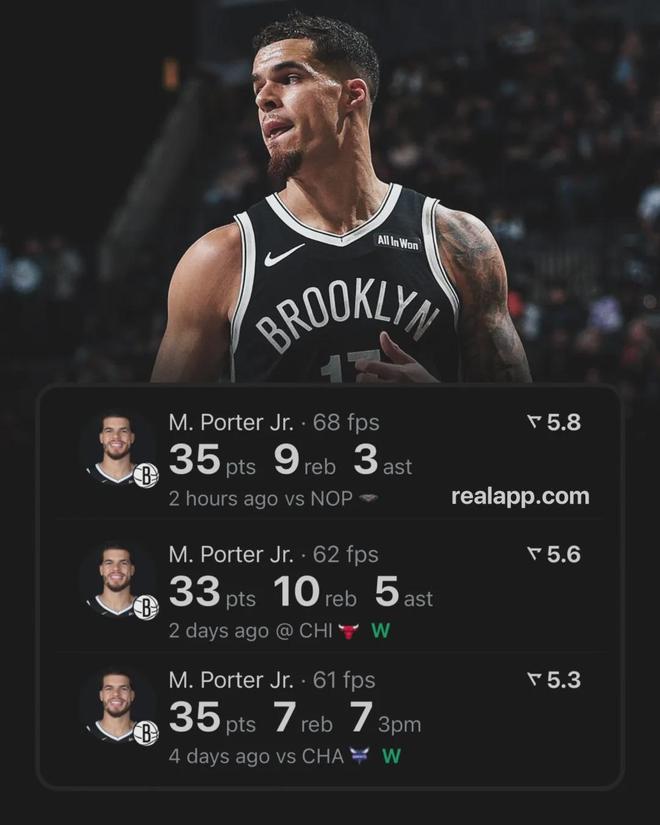 近四场比赛小波特场均狂轰34.3分7.5板3.8助1.5断炸裂数据,本赛季至今场均26.3分7.4板3.2助,投篮命中率50.1%,场均以40.3%命中率扔进3.7记三分球,篮网暂时以6胜18负排名东部第13。